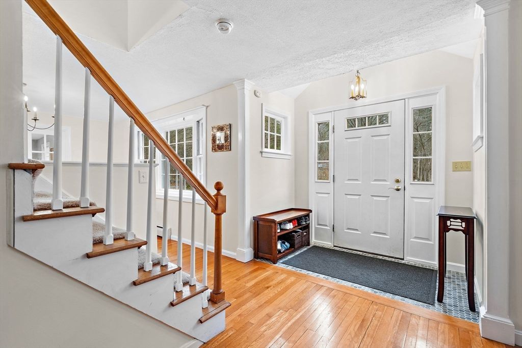 This wonderful gambrel home is located on a quiet cul-de-sac and is set well back off the road. Inside, you'll find a welcoming first floor with versatile spaces perfect for entertaining. Light and bright, the living room features a brick fireplace and hardwood floors. The dining room and family room also have hardwood with a set of French doors that connect the two spaces. A slider leads out onto the screened porch with attached deck. The kitchen features stainless steel appliances, quartz counters and a generously sized island. There is an additional home office space with custom built-ins. The second floor primary suite is accented with...read more