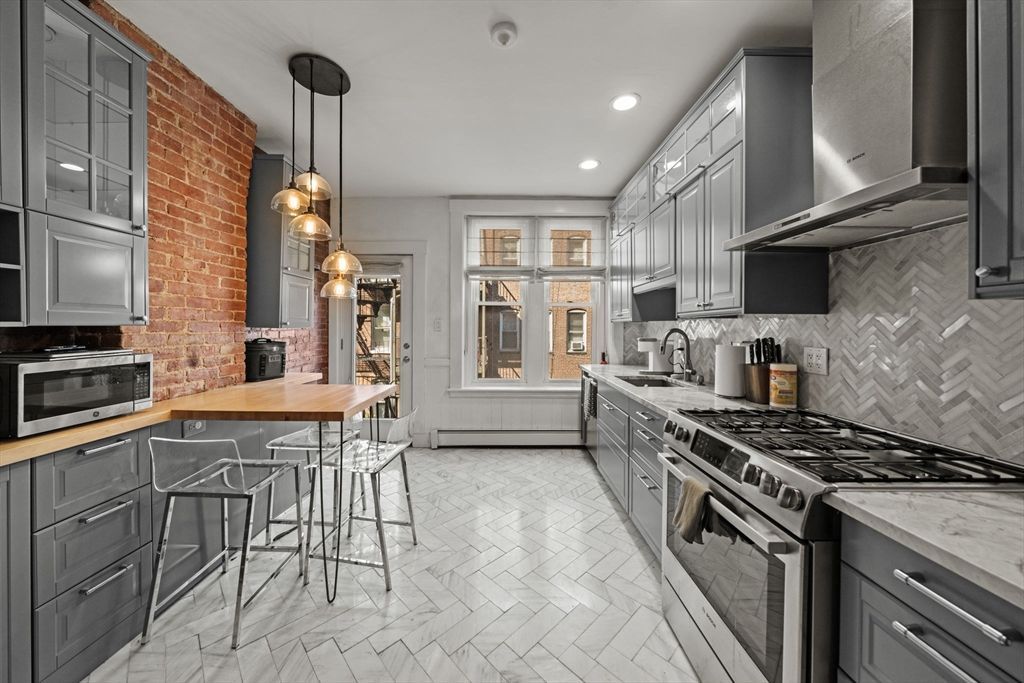 Sun-drenched two-bedroom with in-unit laundry on coveted Cortes Street in Bay Village. Updated brownstone living on the second floor: southern light, soaring ceilings, oversized bay windows and restored hardwoods meld historic charm with modern systems. The showpiece kitchen features custom cabinetry, chevron stone tile, pendant lighting, full-size stainless appliances and a butcher-block breakfast bar??perfect for casual meals or entertaining. Bedrooms are thoughtfully separated for privacy: a generous primary with abundant closet space and a second bedroom with a walk-in and built-ins. Fully renovated bathroom with generous vanity storage...read more