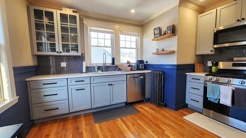 Beautifully renovated three bedroom two bathroom on two levels of a two family home in Brighton. The second floor features recently refinished hardwood floors throughout the large living room, dining room, two bedrooms, bathroom, sun room and kitchen. Kitchen is complete with stainless steel appliances, a built-in microwave, a dishwasher, and plenty of cabinet and counterspace. The third floor boasts a gorgeous master bedroom. Dedicated laundry and storage is in the basement. Patio on the side of the house. Off-street parking available for three cars.