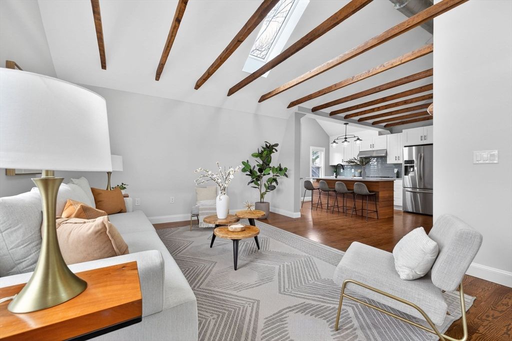 Welcome to this top-floor loft style penthouse set on a quiet, tree-lined street in one of the most sought-after pockets of Somerville. An open, airy layout with restored wood beams and natural light flooding through several skylights defines the home. Inside, you'll find a fully renovated interior grounded in clean & timeless finishes. The kitchen is composed of custom cabinetry, quartz surfaces, stainless steel appliances, and a Bertazzoni range. The intentional kitchen design opens seamlessly into the main living area, creating a perfect space for hosting. Modern comforts include central air, in-unit laundry, a private deck, basement storage,...read more