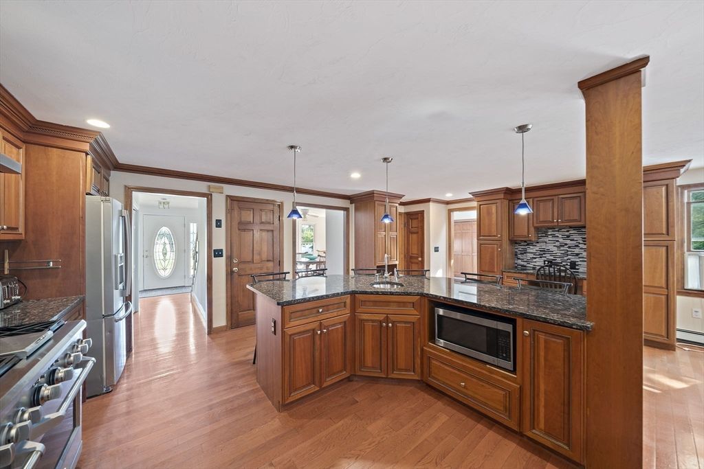 Beautiful Colonial in the highly desirable Rexhame! A rare find in this sought-after community with five bedrooms in the main living space, and an additional bedroom in a separate living area used as an in law! Thoughtfully designed, the first floor has gleaming hardwood throughout, a chef-inspired kitchen with granite counters, large island, custom cherry cabinets and stainless steel appliances, an adjoining family room with gas fireplace, and dining room. The seamless flow leads to the in-law which also presents an opportunity to generate rental income as it includes a sitting room with a gas fireplace and full bath. Upstairs a primary...read more